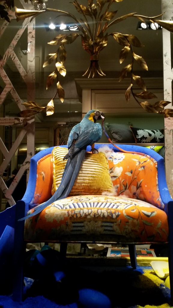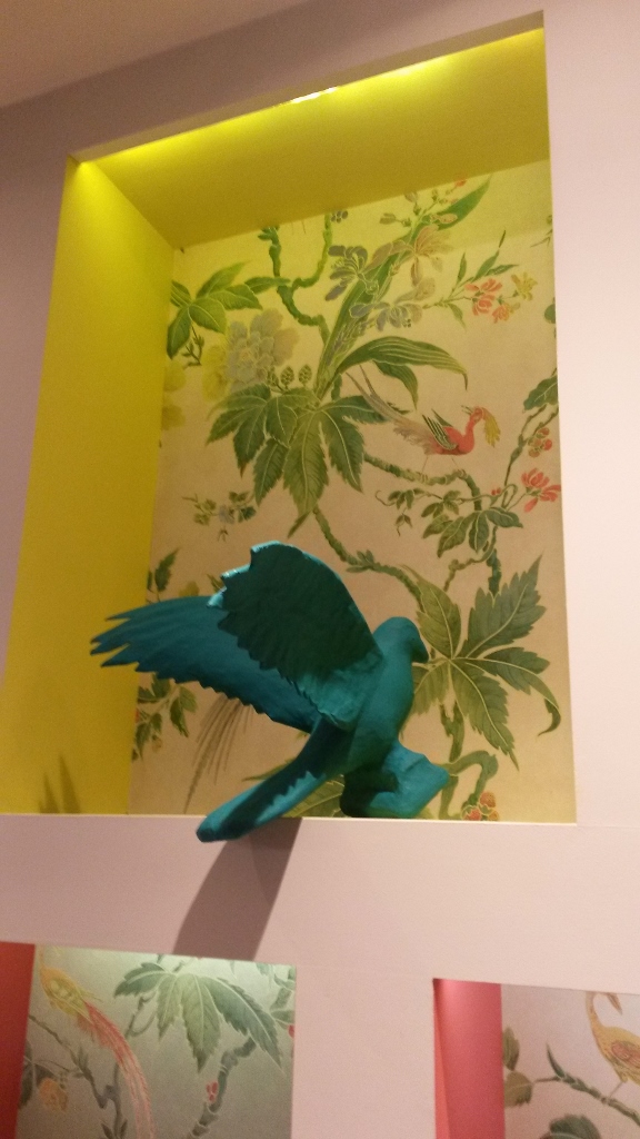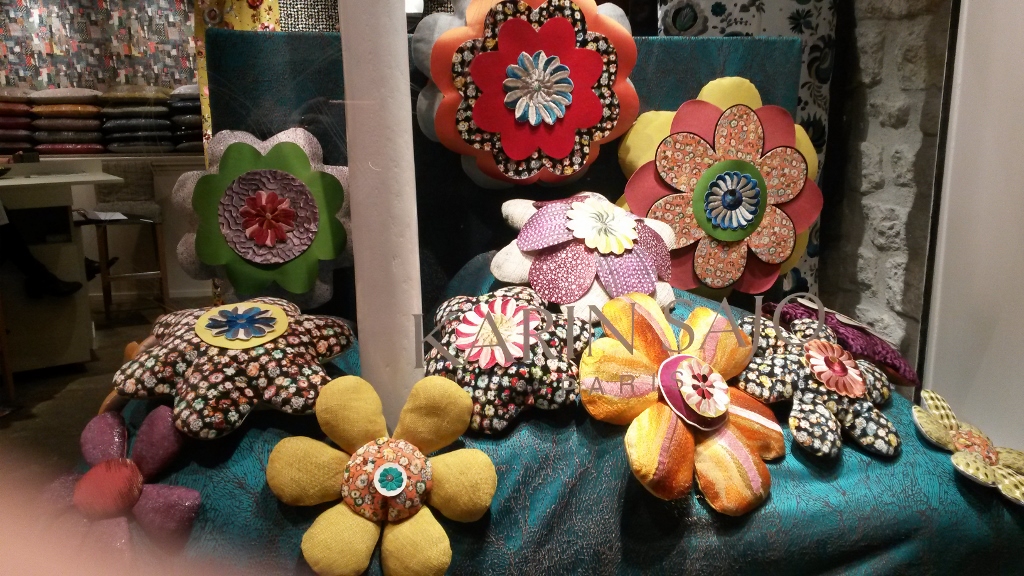 Vanuit hier ben ik de route gaan vervolgen. Zo kwam ik o.a. terecht bij Little Green, bekend van verf en behang. Prachtige kleuren en leuk gedecoreerd. Een wand met in de verf gedoopte kwasten in allerlei kleuren en verder veel vogels. Vogels ben ik sowieso veel tegengekomen tijdens mijn beursbezoek. Ter decoratie, maar ook als dessins op stoffen en vazen. De showrooms van Pierre Frey, het beroemde franse stoffenhuis, ben ik ook gaan bezoeken. Ook hier schitterende stoffen en mooie dessins. Het wordt teveel om over alle showrooms te schrijven, maar over Karin Sajo, Francaise en designer, wil ik graag nog vertellen. Zij had een kleine pop-up showroom in het centrum. Haar eigen showroom is in Montmartre. Ik had het geluk om Karin Sajo zelf aan te treffen. Wij hadden elkaar al eens in Nederland ontmoet. Karin heeft mij haar nieuwe stoffen laten zien en voelen en verteld hoe deze ontwerpen tot stand zijn gekomen, wat haar inspiratie is geweest. Zij is een heel bijzondere en innemende designer en ik ben erg onder de indruk van al haar ontwerpen. Wij hopen elkaar dit jaar weer in Nederland te ontmoeten.